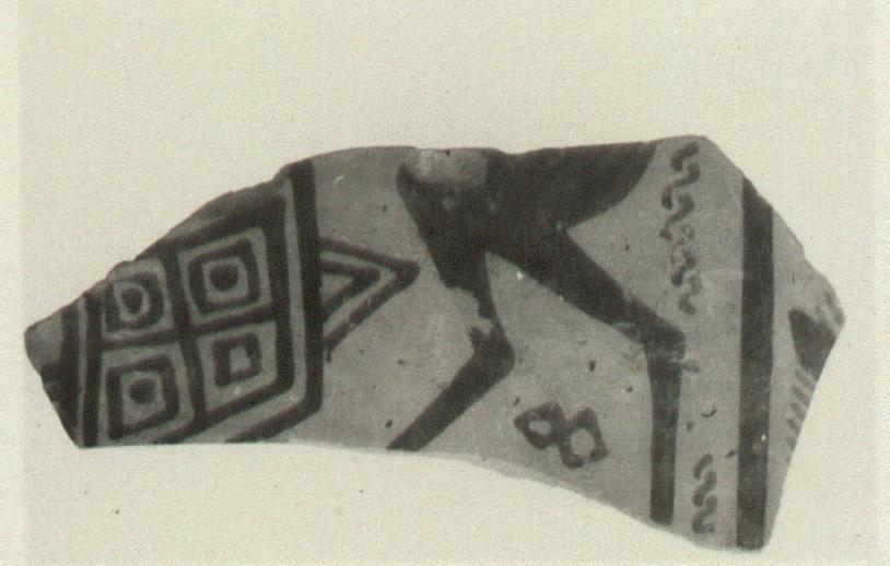 | Description: | To the left of the fragment, a large motif formed of boxed squares. In the cnetre, the lower part of the body and jointed legs (extremities missing) of a bird(?) or horse(?) with filling ornament ("running dog", etc.). To the right a vertical band beyond which are traces of some uncertain decoration. Clay yellow-buff, fairly clean. Thick slip(?). Ornament painted in black to brown glaze. | |