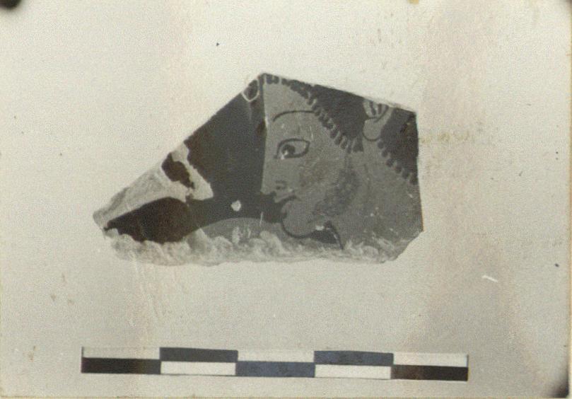 | Description: | Small piece from wall. Head and shoulder of youth, left. Relief contours; dilute glaze details, including sideburns, forelock incised. Cf. Kleophrades Painter, Beazley (1933), Kleoph.Maler, pl. 14(3) and pl. 28(1). | |