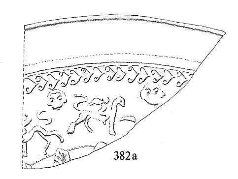 | Description: | The fragments make up into two groups which preserve some two-thirds of bowl; bottom medallion missing; trace of large leaves which surround it. On wall, broad figured zone, with recurring groups: krater with mask above it flanked by Erotes riding panthers. Signature in narrow panel near top of zone: <graphic>. Above, guilloche. Plain rim. Pale buff clay. Glaze almost entirely gone. Cf. P 22218 (= Agora XXI, no. F 157). | |