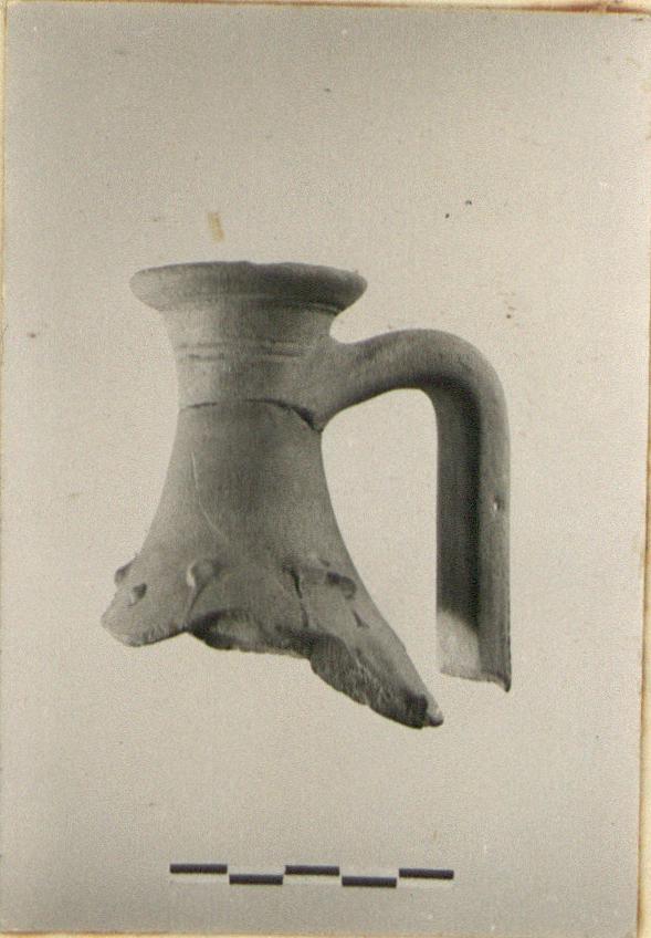 | Description: | Two joining fragments preserve neck, lip and handle. From a jug with high sloping shoulder, narrow neck; everted lip, flat on top; vertical handle with single groove below lip. On shoulder traces of barbotine decoration: buds and tendrils (?). Buff clay; traces of dull black glaze, now mostly disappeared from surface. | |
