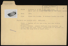 | Description: | Less than one-quarter of rim and side and one handle preserved. Rounded bottom; almost vertical loop handle; no foot; ledge for lid, only a projection to support it. Gritty red clay with a light slip. | |