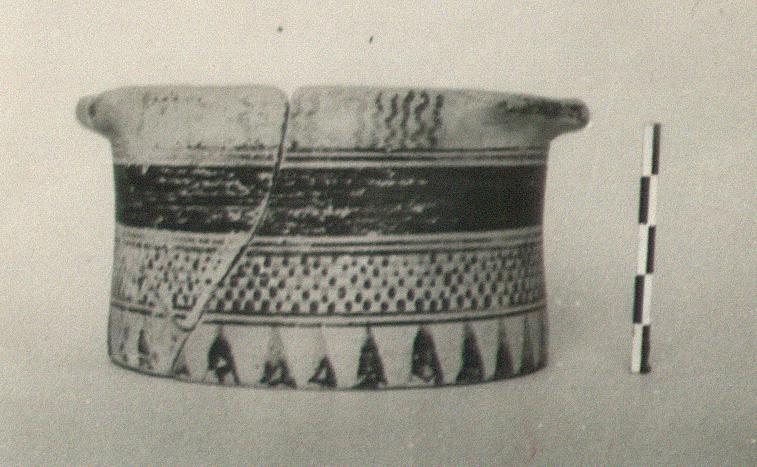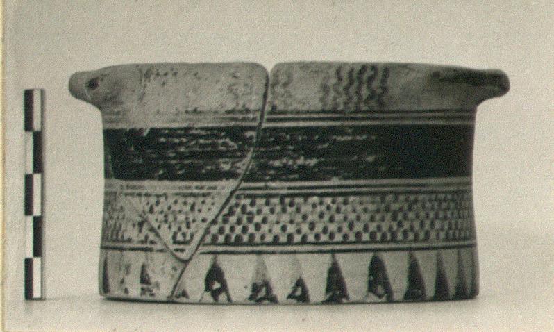 | Description: | Large piece of wall and rim missing, a small piece of the floor and part of one handle. Flat bottom, slightly concave; slightly concave walls; plain rim with no provision for lid. Small horizontal handles at rim with long ends extending along rim at either side. The underside unglazed; the inside glazed solid except at the rim. Outside, four zones of decoration separated by pairs of narrow bands: around the bottom, solid rays; then a band of fine checkerboard; then a band glazed solid with four narrow red bands over; around the lip, groups of vertical zigzags. A band of glaze on the handles. Clay pinkish with pale buff surface; the glaze of the decoration fired black to orange. Protocorinthian. | |