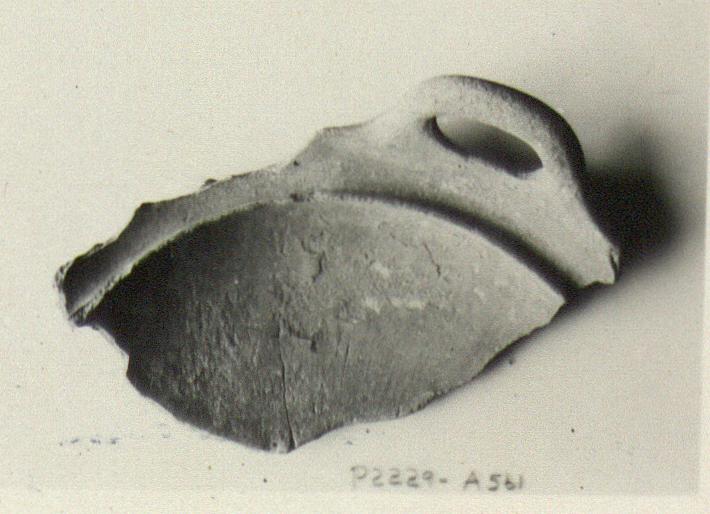 Description:   Less than one-quarter of rim and side and one handle preserved. Rounded bottom; almost vertical loop handle; no foot; ledge for lid, only a projection to support it.