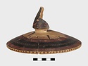 Description:   Several joining fragments give the full circumference of the lid and much of the sides; the top missing, except for the knob, non-joining, about half preserved. Domed lid with narrow downturned edge; large conical knob; a projecting edge at its tip broken away. Decoration red and white over black glaze. On the rim a row of dots; around the knob, large rays. From rays to rim, banded decoration over black: a red band bordered by white lines; white dot rosettes at intervals on the red; further out, a narrow band of turret pattern, white; at the edge a second red band with white borders and rosettes. The knob glazed black except on underside; at the top, between two sets of three narrow white bands, a band of white pendent petals; at the bottom, a broad red band with three narrow white above and below; traces of a rosette over the red.