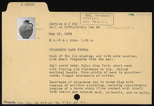| Description: | Much of the lip missing, and both side handles, with small fragments from the wall. Tall ovoid body; false ring foot; short neck with flaring rim flattened on top. Rolled vertical handle, from middle of neck to shoulder curve; finger impression at bottom. Handmade of micaceous red to brown clay with remains of smoother surfacing, carrying considerable remains of a brown stain (from contact with iron?) both inside and outside neck, on handle and on walls. | |