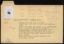 Description:   Fragment from wall of a small closed vase with both vertical and horizontal curve. At the left edge, the fingers of an outstretched hand; or possibly the tip of a wing(?). To the right, an inscription written in heavy white paint in two vertical lines: ΑΛΚΜΕΟΝ ΚΑΛΟΣ. The paint is well preserved except on the second and third letters of the name where the stain alone remains.