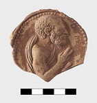 Medallion almost complete: within border of dots, the upper part of a bearded figure, right, wearing a himation leaving the right shoulder free; right arm bent at elbow, hand raised towards chin.