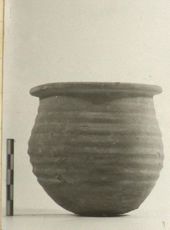 | Description: | Handleless cup. Intact. Round-bottomed cup; deep body with small everted lip. Body wheel-ridged. Hard reddish-brown clay with self-surfacing; unglazed. | |