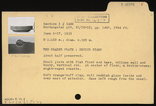 | Description: | About half preserved. Small plate with flat floor and base, oblique wall and heavy, vertical rim. At center of floor, a device stamp: eight-petalled rosette. Soft orange-buff clay; dull reddish glaze inside and over most of exterior. Base left rough from the wheel. | |