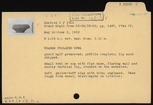 | Description: | About half preserved; profile complete; lip much chipped. Small bowl or cup with flat base, flaring wall and nearly vertical lip, rounded on the exterior. Soft yellow-buff clay with bits; unglazed. Base rough from wheel; wheel marks on interior. | |