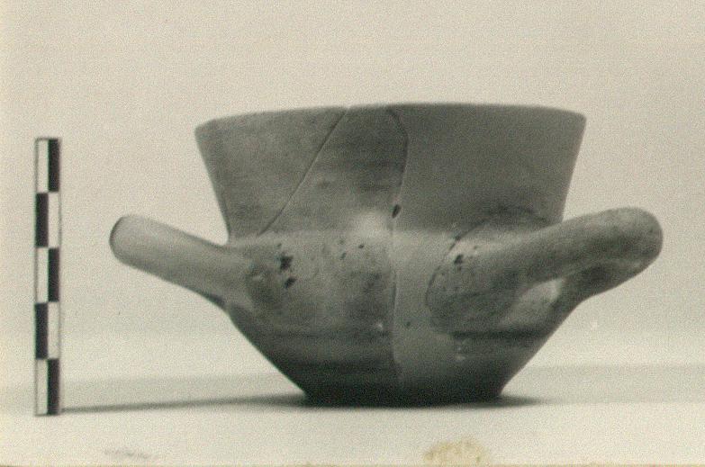 Description:   Two fragments apparently from a bowl like P 22414. One fragment preserves full profile to start of foot; the other, one handle. Restored in plaster.