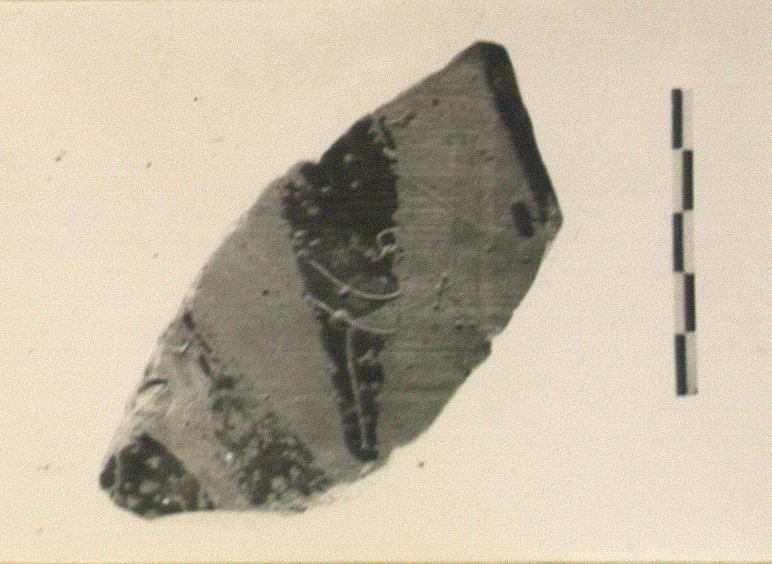 | Description: | Fragment of neck of early black figured amphora. Head, part of the neck and upper part of the body of a goose. The eye and interior lines of the bill are incised. Traces of red on head above bill and on wing. To right of goose, traces of border of panel(?). Heavy rather coarse fabric. Much worn. | |
