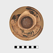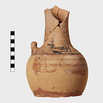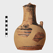 | Description: | Upper part mended from several pieces; rim, part of neck and most of handle missing; one wall fragment does not join; no join between upper part and bottom. Low ring foot; globular body; twisted handle. Body to shoulder covered with glaze bands alternating with reserved bands in each of which two narrow glazed bands. On shoulder, at center, panel of horizontal chevrons, framed by pairs of narrow bands; to either side, a water bird, facing in; then black glaze. On the neck, reserved panel at front; above, hatched maeander, with a central rectangle filled by horizontal chevrons; below, dotted double zigzag; all framed by narrow bands in twos and threes. Lip glazed. Pinkish-buff clay; black glaze, much worn. | |
