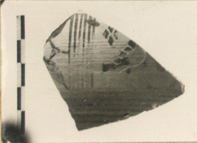 | Description: | Wall fragment. Panel decoration, divided by six narrow vertical lines; horizontal bands above and below. In left hand panel, floral ornament; in right hand panel, part of a bird, right; filling ornament of diamond motif, small swasika; below the bird's tail a small circle (or omicron?). Incision on the bird's wing; facing the bird, one foot and a little of the second creature. Yellow-buff clay; dull glaze partly worn off; inside glazed. | |