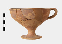 | Description: | Foot, handle and about half of body preserved, mended from several pieces. Restored in plaster. Broad thin foot, short stem, deep bowl; lip slightly everted. Reddish-brown glaze, much worn, dull; over all except beneath foot. Buff clay with bits. | |