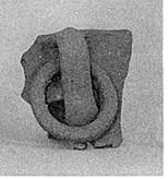 | Description: | Single wall fragment, broken all around. From vertical wall with offset sloping shoulder. Vertical handle from wall to shoulder, with a freely moving loop handle attached to it. Rather coarse reddish clay of cooking ware fabric; brownish surfacing. | |