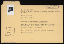 | Description: | From wall of open black glazed vase; column krater? Part of hole for ancient mend to pot at edge of ostrakon. Good black glaze outside; inside brownish. Incised outside: <graphic> | |