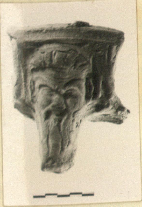 | Description: | Blackened by fire. Bearded Satyr head. | |