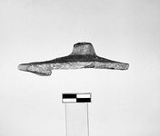| Description: | Small segment only remains. Very slightly convex with rim thickened and turned under on underside and pierced knob at middle. Gritty orange clay, gray on surface. ADDENDA North African shape -but fabric is odd [JWH]. | |