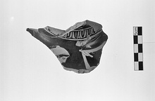 | Description: | Two joining fragments preserve part of neck and shoulder; broken all around. Band of egg and dot pattern at base of neck. Head of woman right, wearing sakkos with white strings. On wall in front of her, taenia. Relief contour for profile. Glaze outside somewhat damaged; inside rather thin glaze, red to brown, to base of neck. Other hydria fragments from this vicinity are P 22163, P 22164. | |