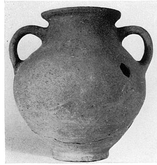 | Description: | Mended from two pieces. Small parts of the wall and of the foot missing; cracked. Ring foot; short neck opening toward the shoulder; flaring rim, flat on top; two vertical handles, round in section, with finger impression at lower attachment. Handmade. Reddish-brown clay with many dark and white bits. Remains of the once smooth surface. | |
