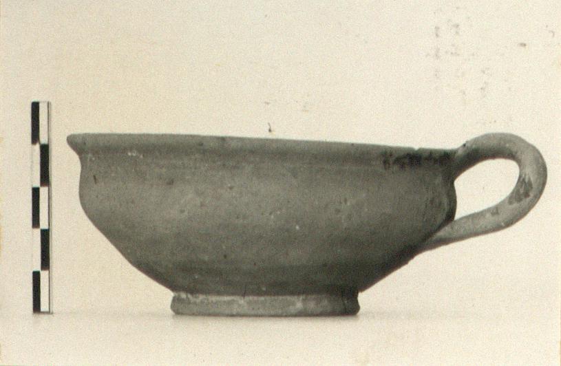 Description:   Complete but cracked nearly across. Shallow one-handled cup; low base, concave on bottom; band handle from out-turned lip.