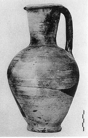 | Description: | Mended from several pieces. About half of body missing. Restored in plaster. Tall, slender ovoid body, ring foot. High spreading neck with thickened lip sloping to the exterior. Rim to shoulder handle. Grooves at lower handle attachment, at base of neck, on top of lip and on handle. Dark buff clay with bits; dull purplish-brown glaze on exterior to below shoulder. | |