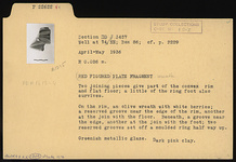 | Description: | Two joining pieces give part of the convex rim and flat floor; a little of the ring foot also survives. On the rim, an olive wreath with white berries; a reserved groove near the edge of the rim, another at the join with the floor. Beneath, a groove near the edge, another at the join with the foot; two reserved grooves set off a moulded ring half way up. Greenish metallic glaze. Dark pink clay. | |