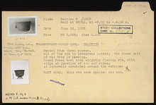 | Description: | Mended from three pieces. All of the rim is preserved intact, the lower part of the vase is missing; restored in plaster (on the basis of P 13071). Round Roman bowl with slightly flaring rim, with ridge at junction of rim and sides. At intervals scratched around the outside: <graphic> Buff clay; thin red wash inside and out. | |