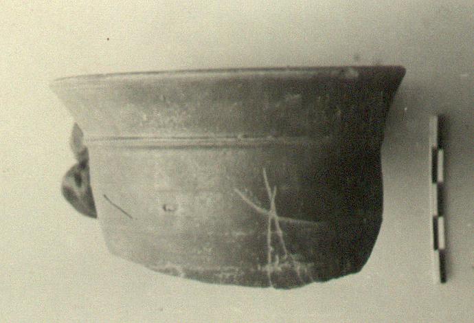 | Description: | Mended from three pieces. All of the rim is preserved intact, the lower part of the vase is missing; restored in plaster (on the basis of P 13071). Round Roman bowl with slightly flaring rim, with ridge at junction of rim and sides. At intervals scratched around the outside: <graphic> Buff clay; thin red wash inside and out. | |