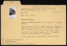 | Description: | Amphora fragment mended from two pieces. Slightly convex. Front part of donkey or mule to right; nostril, teeth and jawbone incised; white of eye reserved. Upper left, pendent spiral; below, row of open hooks and dots. To right, diagonal row of lozenges; below, filling ornament of zigzags. Pinkish-buff clay; black glaze, somewhat worn. | |