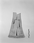 Description:   Fragmentary stand, mended from many pieces. Several non-joining fragments. Wall thickening near top indicating that it is near joint(?). Flaring base, offset by groove. Stand divided horizontally into three sections by two other grooves. Openwork consisting of long slots, with those of the bottom and top sections in line, and that of the middle section in between. On bottom section, in one panel, large motif composed of a curving line ending above in a spiral at either side, inturned; the spirals joined by lines. Row of dots diagonally across ornament. Man on horse to right, in second panel; he seems to float above horse with one long leg visible below horse's belly. Has spear and plume. Horse is striding; head missing but part of rein(?) visible in front. Figures on third panel indistinguishable; vertical rows of dots visible. Filling ornament of dot rosettes. Second and third section worn; but vestiges of spirals and dot rosettes remain.