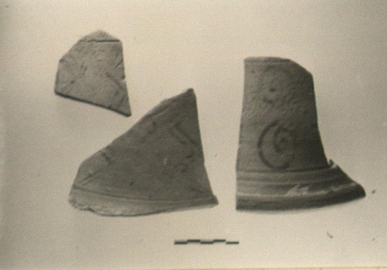 | Description: | Three non-joining fragments of a large stand; openwork. a) Panel and part of base. Profile of whole slightly flaring. Thick flaring base of torus-moulding type. Panel separated on the sides by long narrow slits with rounded ends, on top and bottom by grooves. In panel, upright double spiral, beaked. Whole panel surrounded by line. On base one thin line above torus, on torus one broad band, below, two thin lines. b) Panel with double St. Andrew's cross with the angles closed by double corners to form uneven diamonds. c) Panel, perhaps from an upper zone. Flaring outward at top. Groove at top; panel surrounded by line; ornaments as in b). Pinkish-buff, chalky clay. Red glaze, very worn. | |