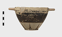 | Description: | Kotyle, mended from several pieces. Both handles, parts of rim, small pieces of body, restored in plaster. Low ring foot; rim curves slightly in. Rays from bottom to about one-third up. Above, solid glaze except in handle spaces. Traces of narrow white bands over the glaze; thin white line at rim; three concentric circles on underside. Light buff clay (greenish deposit on bottom?); glaze greenish to black, somewhat shiny. Protocorinthian. | |