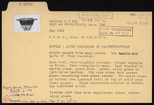 | Description: | Kotyle mended from many pieces. One handle and parts of body restored. Disk foot, very slightly concave. Slight omphalos on floor. Very irregularly made. Rays bound by narrow lines, above foot. Above, solid glaze to just below handles. Rim zone shows thin uneven glaze resembling worn glaze inside. Two white lines at bottom; one (perhaps two?) at top of solid zone (over glaze). Three concentric circles on bottom, the innermost solid. Pinkish-buff clay with impurities; black, rather shiny glaze. Attic imitation of Protocorinthian.§§ | |