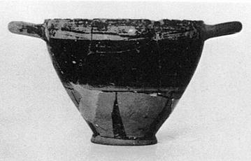 | Description: | Kotyle mended from many pieces. One handle and parts of body restored. Disk foot, very slightly concave. Slight omphalos on floor. Very irregularly made. Rays bound by narrow lines, above foot. Above, solid glaze to just below handles. Rim zone shows thin uneven glaze resembling worn glaze inside. Two white lines at bottom; one (perhaps two?) at top of solid zone (over glaze). Three concentric circles on bottom, the innermost solid. Pinkish-buff clay with impurities; black, rather shiny glaze. Attic imitation of Protocorinthian.§§ | |
