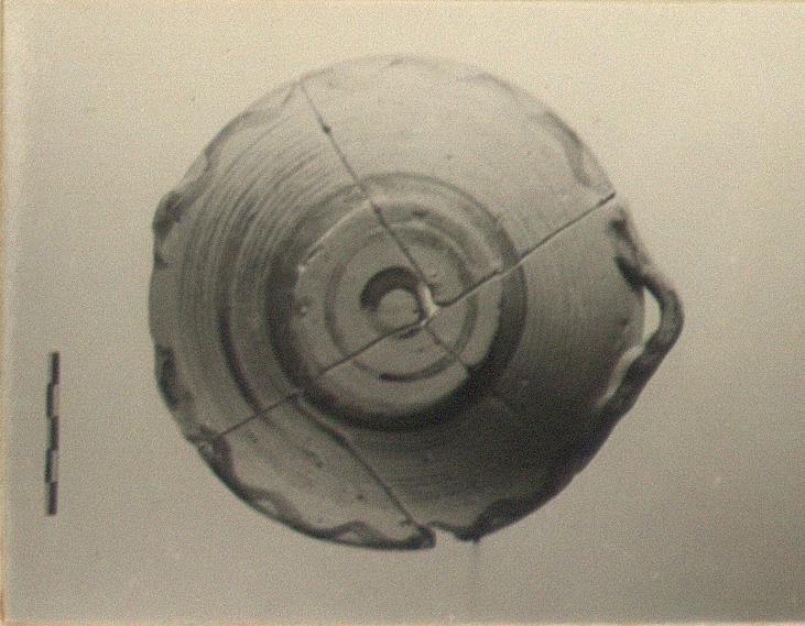 | Description: | Plate mended from five pieces, one handle missing. Low disk foot, shallow convex body. Handles attached at rim. Inside, solid glaze except for reserved circle toward center. Verticals on rim. Wavy band below rim outside; rest of outside covered with narrow bands. Broad band near foot. Two concentric circles on bottom. Pinkish-buff clay; red to black dull glaze. | |