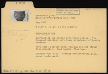 | Description: | One-handled cup mended from three pieces. Rim fragment missing; only lower attachment of handle remains. Very deep, pointed body; flaring rim not offset from shoulder. Band handle, flat base. Pinkish-buff clay. Streaky reddish-brown glaze except underneath. | |