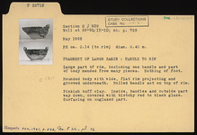 | Description: | Large part of rim, including one handle and part of body mended from many pieces. Nothing of foot. Rounded body with wide, flat rim projecting and grooved underneath. Rolled handle set on top of rim. Restored in plaster with second handle. Pinkish-buff clay. Inside, handles and outside part way down, covered with blotchy red to black glaze. Surfacing on unglazed part. | |