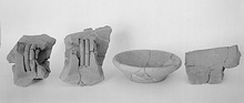 | Description: | Mended from many pieces; small parts of body restored in plaster. Broad slightly concave resting surface. Flaring sides; rim rolled, set off from sides by groove. Pinkish-buff clay with many impurities. Heavy fabric. Flinty grit over grinding surface, ground away in center. | |