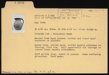 | Description: | Mended from many pieces; bottom and front half restored in plaster. Round body; curved neck; rolled handle attached to flaring, flat rim. Wall apparently cut through to insert lower handle attachment. Buff gritty clay, burnt in places. Some surfacing preserved. Handmade. | |