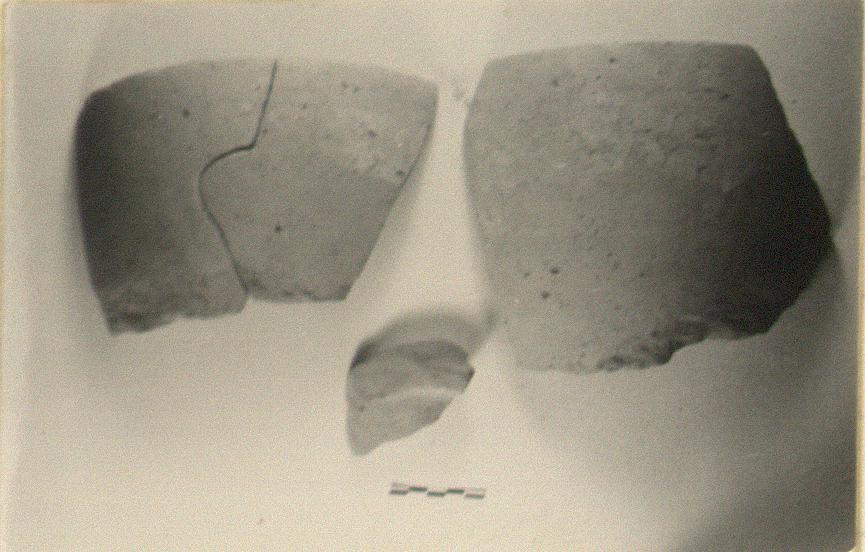 | Description: | Four pieces, mending to three. a), b), c) Slightly concave, preserving a slightly thickened, rounded rim or standing surface, somewhat drawn in and with a band of glaze on the inside. a) and b) Very smooth, curved (broken?) edges which join. c) Strong thickening on edge opposite the rim or base(?) and a rounded finished edge with traces of glaze on side. The thickening suggests the start of a floor above. d) Part of a vertical handle attachment(?). Heavy buff clay with impurities. Traces of white surfacing on outside. | |