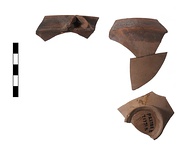 Description:   Four joining fragments give complete profile; one small piece does not join. Ring foot; steep sides; inturned rim; small horizontal handle attached to rim.