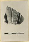 Description:   Broken all around. The spines of two leaves are preserved in dark color against the ribbing in low relief; a bit of green relief is visible between the leaves at the top.