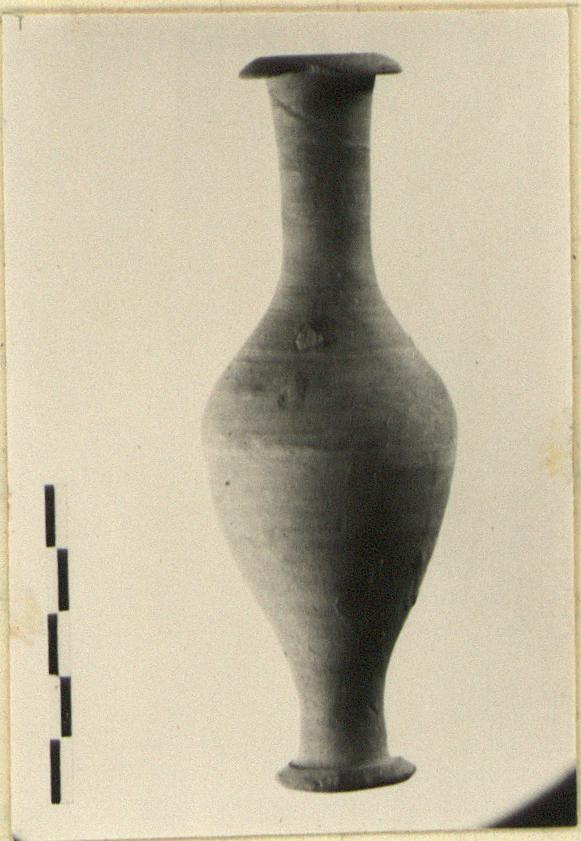 | Description: | Rim and foot chipped, otherwise intact. White bands below shoulder and on neck. Clay reddish-gray on surface. | |