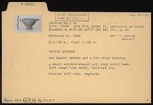 | Description: | One handle broken and a few chips missing. A small skyphos-shaped pot; high solid base, left rough from wheel: inturned lip. Pinkish-buff clay, unglazed. Miniature votive skyphos. | |