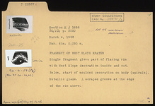 | Description: | Single fragment gives part of flaring rim with West Slope decoration inside and out. Below, start of molded decoration on body (spirals). A scraped groove at the edge of the rim above. Metallic glaze. | |