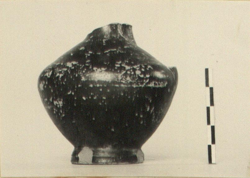 | Description: | Neck and handle missing. Globular squat lekythos on high ring foot. Chipped blackish-brown glaze. | |