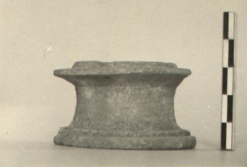 | Description: | Large chips from base and rim. Small pyxis with slightly concave sides and broad flat bottom projecting beyond the sides and molded above. Rim low, nearly vertical; below it a broad vertical flange. Light brownish clay; considerable traces of white over, and a little pink. | |