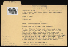 | Description: | Mended from two pieces; from shoulder. Two male figures facing each other; part of the forehead of the one at the left and the head of that at the right wearing a fillet, preserved. Spearhead between them, held by one of them. Ivy wreath above: the leaves alternated black and purple, and purple band at the sides of the panel. Purple also for the top of the head of the figure at the left and for the fillet on the other. Light red clay; unglazed inside. ADDENDA Possibly an amphora (D.B. 1959). | |